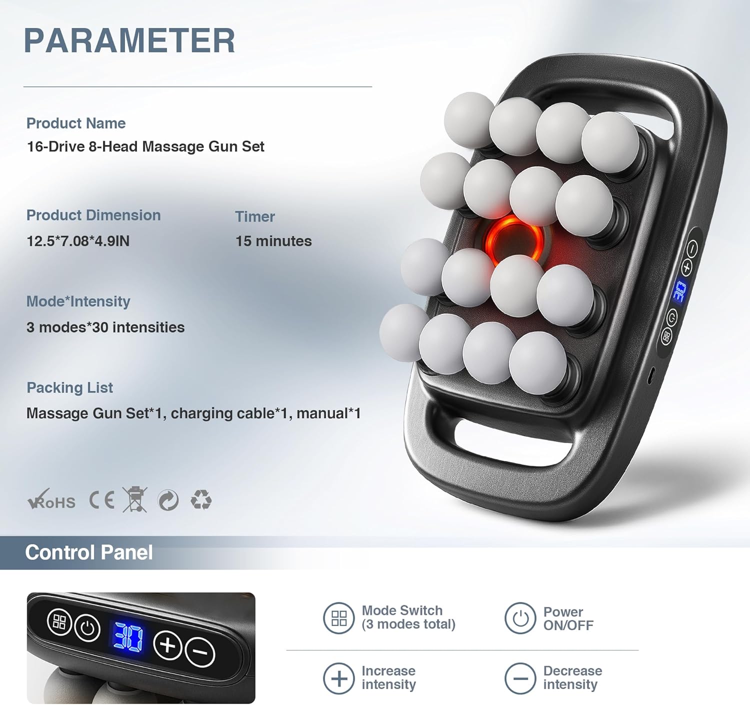 Equipped with 16 interchangeable massage heads, you can target every muscle group with precision — from legs, glutes, and lower back to shoulders, arms, and deep trigger points. Choose from 3 smart modes and 30 adjustable intensities to personalize every session, from gentle relaxation to powerful deep-tissue therapy.
